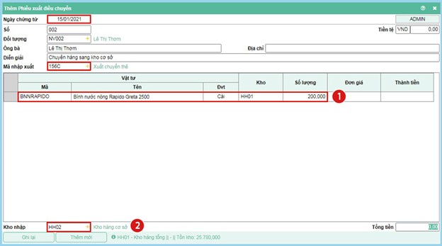 | Kho nhập (2) | Là kho tiếp nhận thêm vật tư hàng hóa về nhập kho. |