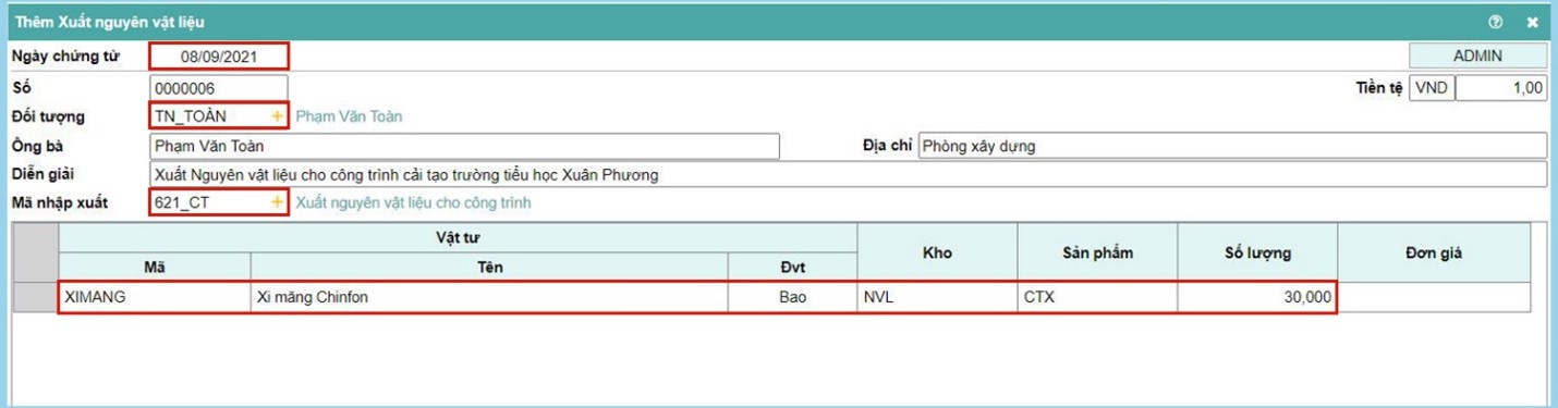 Ngày 08/09/2021, Xuất kho 30 bao xi măng cho Trưởng nhóm Phạm Văn Toàn phụ trách xây dựng Công trình cài tạo trường tiểu học thị trấn Xuân Phương.